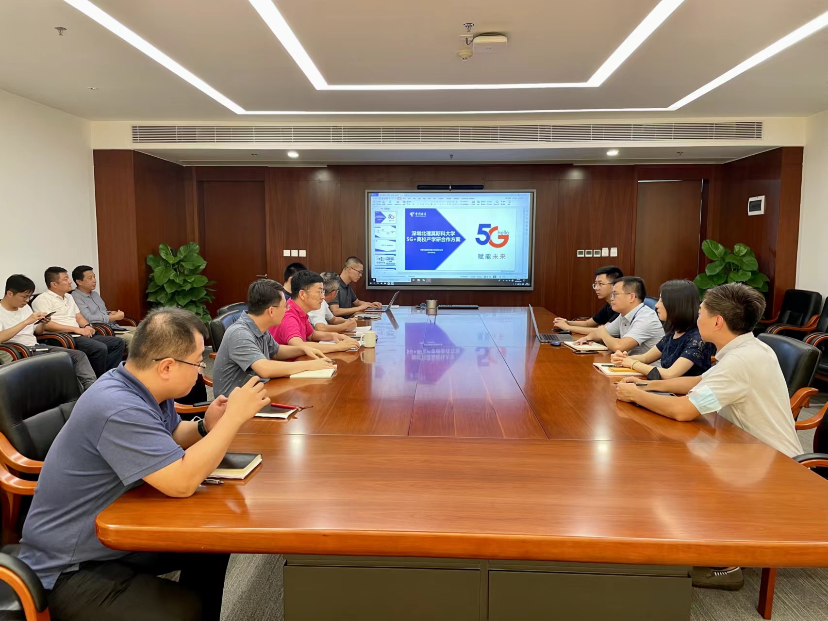 2022年8月29日,中國電信股份有限公司深圳分公司教育行業副總監張貴武、能力中心教育行業專家唐天柱,龍崗分公司教育行業總監向碧雄、商務經理蔡慶業來校溝通深北莫-中國電信深圳分公司5G+智慧校園聯合實驗室掛牌儀式暨5G+智慧校園論壇籌備工作。條件保障部部長彭巨光、材料系秦慶華教授、副部長劉永明、胡旦、信息化辦公室主任鐘南星、條件保障部資產與實驗室工作組負責人王昭及條件保障部相關人員出席籌備會議。