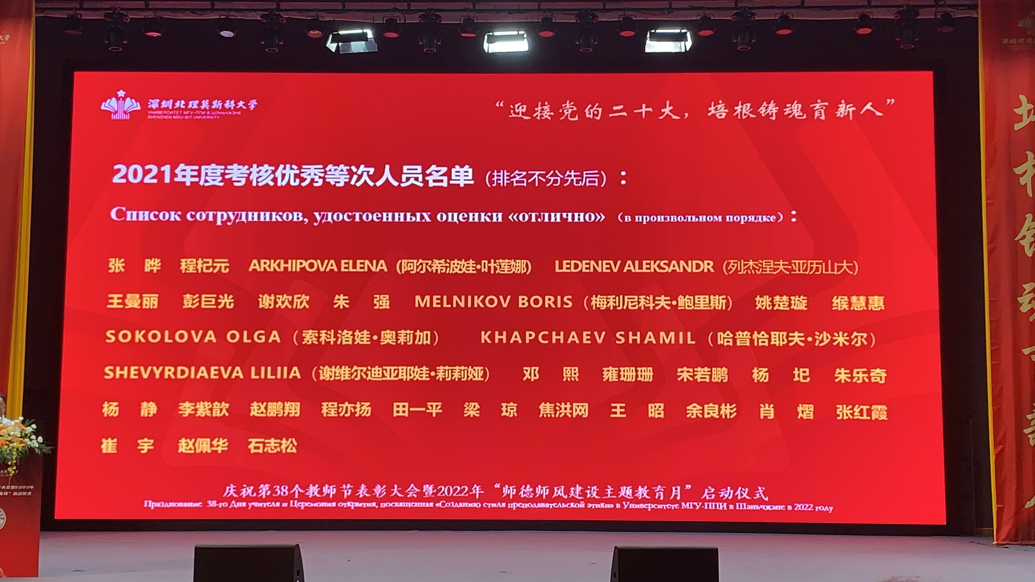 9月8日,學校在禮堂舉行了慶祝第38個教師節表彰大會。條件保障部在《深圳北理莫斯科大學關于2021年度考核優秀等次人員的通報》、《深圳北理莫斯科大學關于頒發2022年度教職工長期服務榮譽的決定》兩項表彰中獲獎: