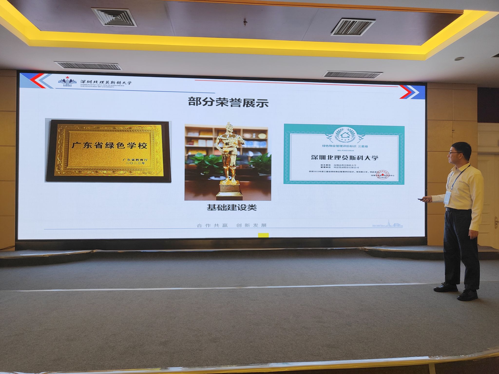 會上,深圳北理莫斯科大學條件保障部部長彭巨光教授受邀上臺,就“深圳北理莫斯科大學后勤保障堅持高質量發展的實踐與探索”發表演講。彭巨光部長從“深圳北理莫斯科大學介紹、條件保障部介紹、學校的后勤運作模式和工作內容說明、學校的后勤合作伙伴簡介、學校后勤發展未來期望達成的目標”五個方面向兩百多名與會嘉賓進行深北莫后勤工作介紹和經驗交流。