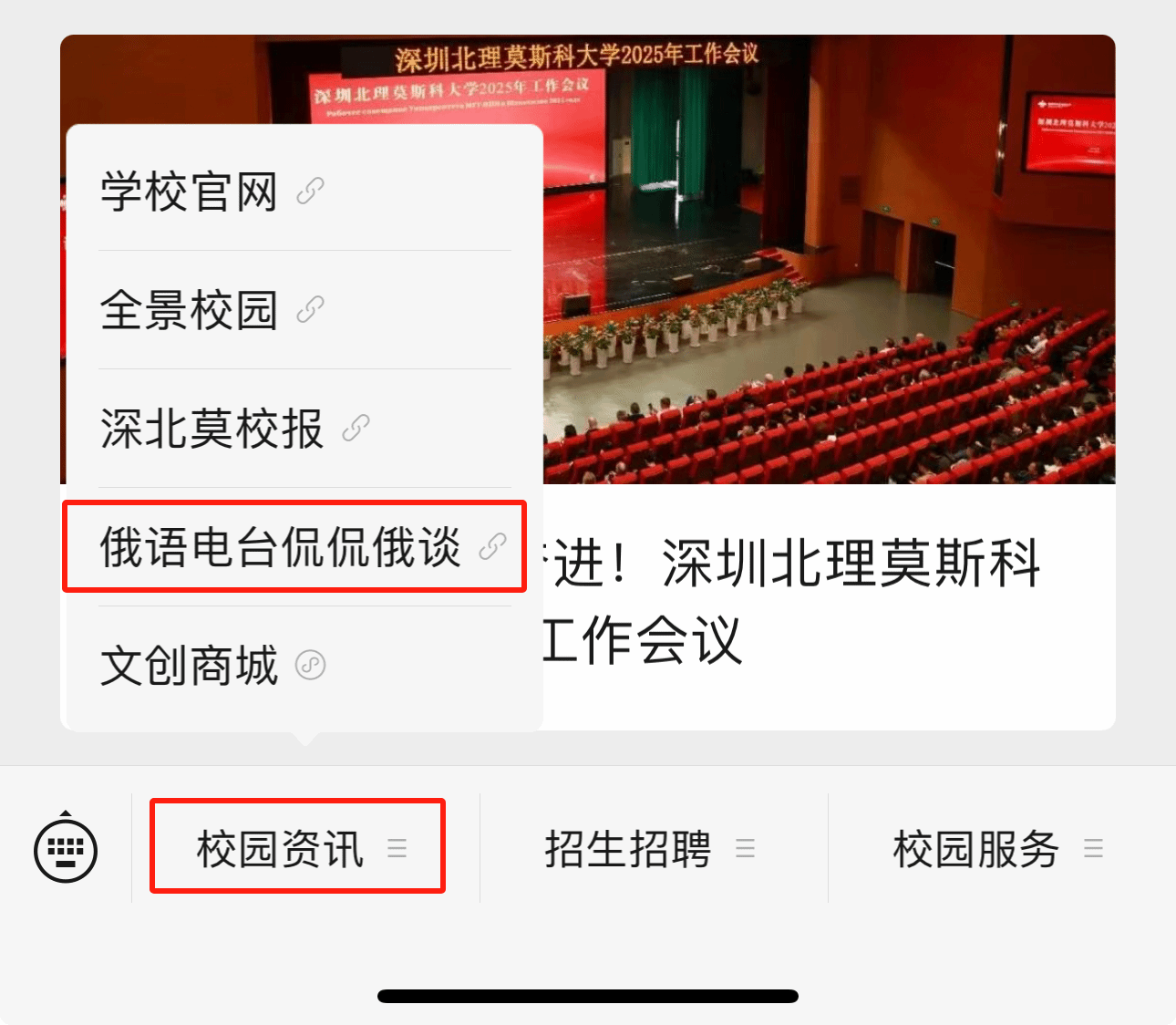關(guān)注“深圳北理莫斯科大學(xué)”公眾號(hào),點(diǎn)擊菜單欄“校園資訊-俄語(yǔ)電臺(tái)侃侃俄談”即可收聽音頻節(jié)目;
