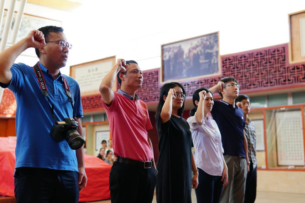 同學們在東江縱隊紀念館講解員的指引下認真參觀了紀念館展廳、文物廳,觀看了東江縱隊紀錄影片,從而進一步了解東江縱隊的革命歷程和光輝事跡,并學習感受先輩們的優秀革命精神傳統。在東縱講堂,教職工和學生黨員同志面向黨旗重溫入黨誓詞,緬懷革命先烈,不忘入黨初心。