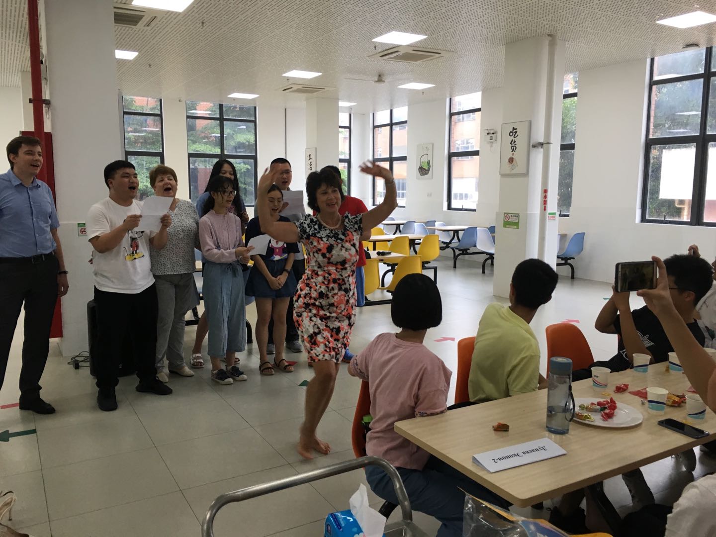 學術(shù)部部長卡爾梅科夫為大家高歌一曲《長長的路》,美妙的歌聲讓人仿佛置身莫斯科大劇院。2017級本科生助教與俄羅斯老師一起演唱了大家耳熟能詳?shù)亩砹_斯歌曲《喀秋莎》,科羅特科娃老師更是伴著歌聲即興獻舞,為同學們制造了一份意外的驚喜,現(xiàn)場氣氛熱烈。