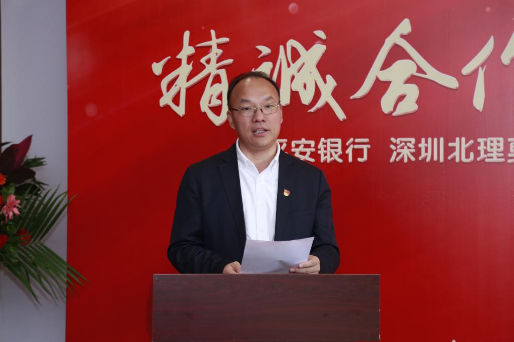 朱迪儉書記介紹了基金會的成立情況,感謝深圳市政府、深圳市教育局、民政局和各相關(guān)部門、企業(yè)對基金會成立給予的關(guān)心與支持。他指出,學(xué)校在辦學(xué)三方的通力協(xié)作和社會各界的大力支持下,各項(xiàng)事業(yè)得到了快速發(fā)展。平安銀行此次捐贈款不僅促進(jìn)了深北莫教育基金會的正式成立,也必將對學(xué)校的學(xué)科建設(shè)、教學(xué)科研、專著出版以及高端人才引進(jìn)等方面發(fā)揮更大的推動作用。