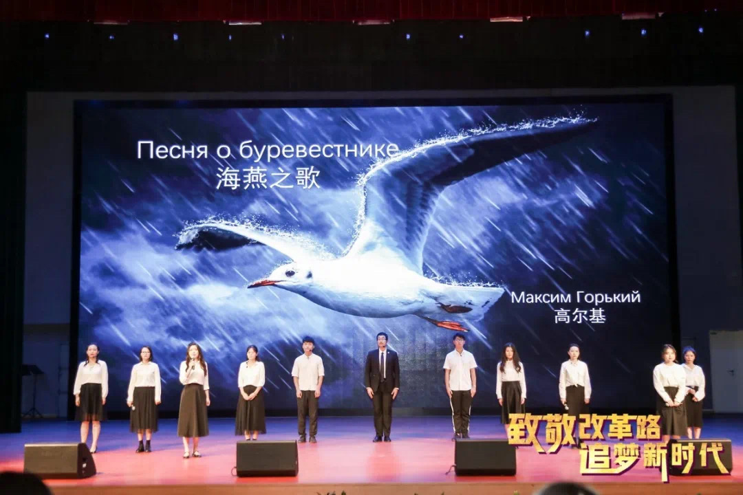 其中,深北莫在校師生演繹的中俄雙語朗誦詩歌《海燕》《我記得》《我不嘆惋、呼喚和哭泣》將活動推向高潮。“這是勇敢的海燕,在怒吼的大海上,在閃電中間,高傲地飛翔;這是勝利的預言家在叫喊——讓暴風雨來得更猛烈些吧!”高爾基筆下勇敢歡樂的意象和激情澎湃的情感由深北莫學子用俄語演繹得淋漓盡致,讓在場的觀眾心潮澎湃;《我記得》《我不嘆惋、呼喚和哭泣》則由中國師生用俄語朗誦、部分俄羅斯師生用中文朗誦,引起現場觀眾深情共鳴和陣陣熱烈掌聲。