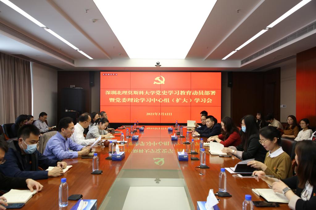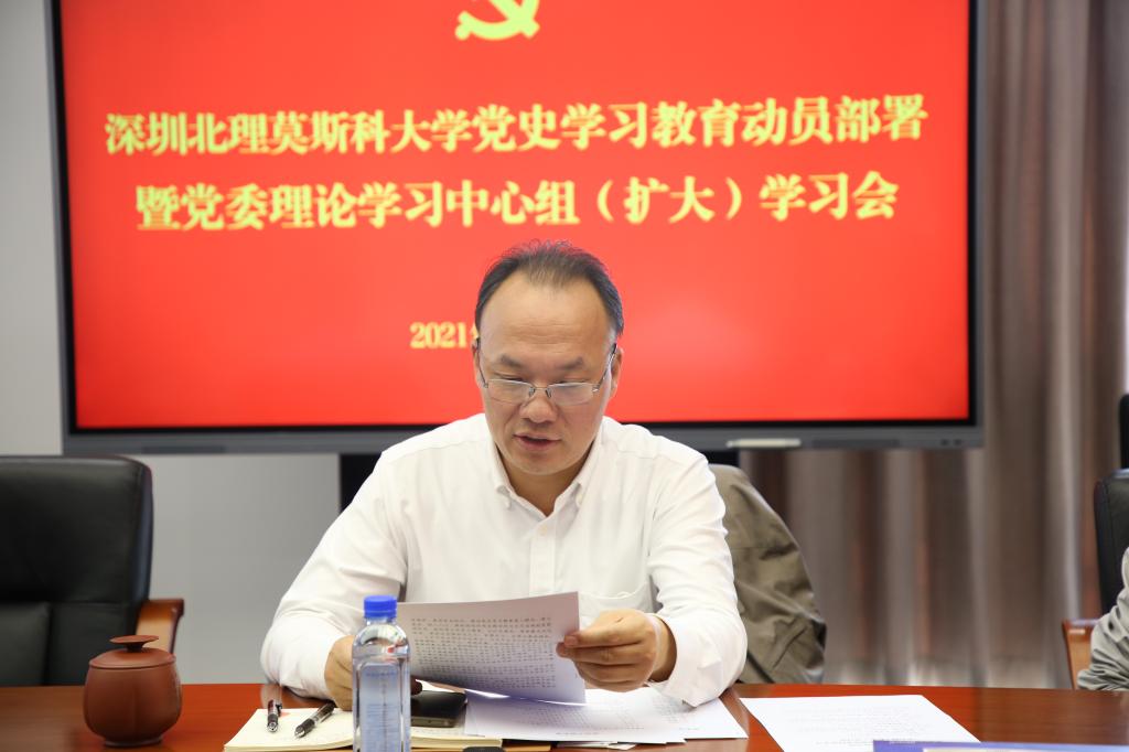 3月12日上午,深圳北理莫斯科大學在主樓651會議室召開黨史學習教育動員部署暨黨委理論學習中心組(擴大)學習會議,認真學習貫徹習近平總書記在黨史學習教育動員大會上的重要講話精神,傳達學習廣東省、深圳市動員大會精神,對全校黨史學習教育進行全面動員部署。學校黨委書記朱迪儉作動員講話,校長李和章、黨委委員、紀委委員、各黨支部書記、部門副職以上黨員干部、思政課教師、輔導員、師生黨員及入黨積極分子代表參加會議。會議由黨委副書記郭彥懿主持。