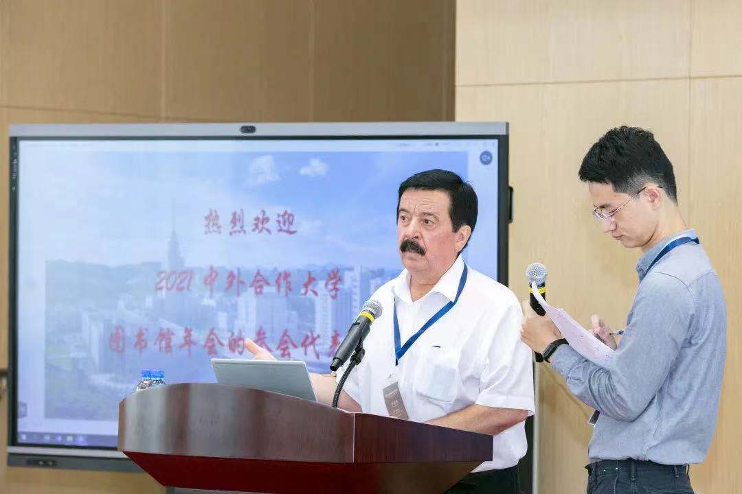 作為該屆圖書館年會的主辦方,深圳北理莫斯科大學圖書館館長朱強宣布會議開幕。深圳北理莫斯科大學第一副校長謝·米·沙赫賴代表學校致辭。沙赫賴第一副校長以自己兒時的經歷為例,闡述了圖書館在人的一生中所帶來的有益影響并強調了圖書館在大學發展中的作用,精彩的致辭贏得了大家的陣陣掌聲。