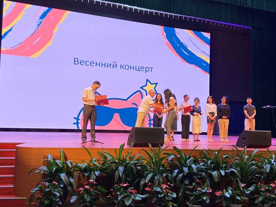在音樂會開始前,還舉行了“2021羅蒙諾索夫國際青年學術會議”和“莫斯科大學國際視頻藝術節”的頒獎典禮。俄語系系主任列杰涅夫、副系主任周興武和俄語中心教師代表莎珀瓦洛娃·葉·瓦共同為獲獎學生頒獎。