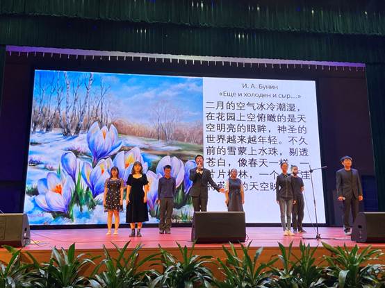 詩歌小組朗誦了俄羅斯經典詩歌。布寧在《生命的愛情和歡樂》中寫道“不,將我吸引的不是美景,令我徜徉的不是五顏六色,而是在這五彩繽紛中閃耀的生命的愛情與歡樂。”詩歌字里行間流露出詩人渴望春天到來的迫切心情。同學們聲情并茂的朗誦將詩人內心的歡快心情表達的淋漓盡致。在博納科夫的《我不需要百合花》和阿赫瑪托娃的《百合花》中,同樣感受到了詩人因春天來臨,萬物復蘇而發自內心的喜悅之情。