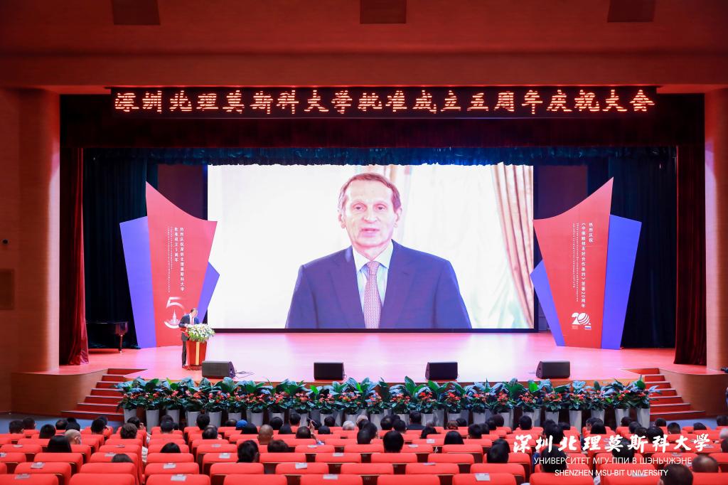 上午十時整,慶祝大會正式開始,由深北莫師生帶來的俄羅斯風情表演和深圳北理莫斯科大學五年回顧短片揭開慶祝大會序幕。俄羅斯歷史協會主席、前國家杜馬主席、原深圳北理莫斯科大學籌建組委會主席謝爾蓋·納雷什金發來祝賀視頻。他指出,經過五年發展,深北莫已經成為科學教育領域中俄戰略合作最為耀眼的范例。深北莫的畢業生們或參與大型企業的經濟項目,或投身基礎科學研究,促進跨文化對話。他堅信隨著俄中合作的進一步發展,對這類人才的需求會越來越多。