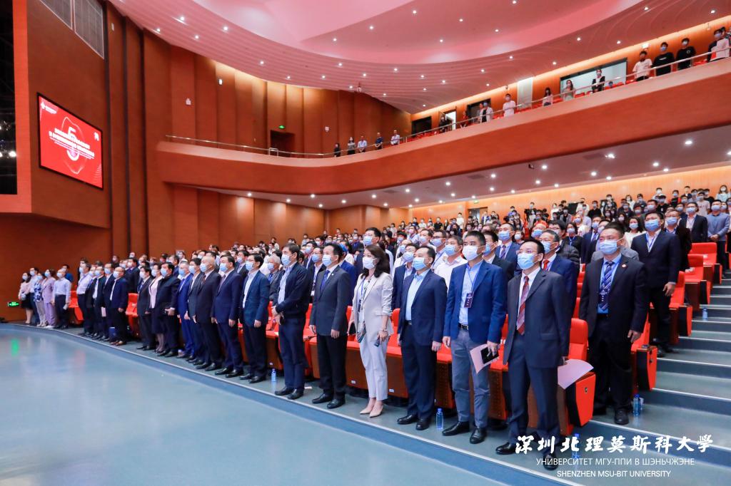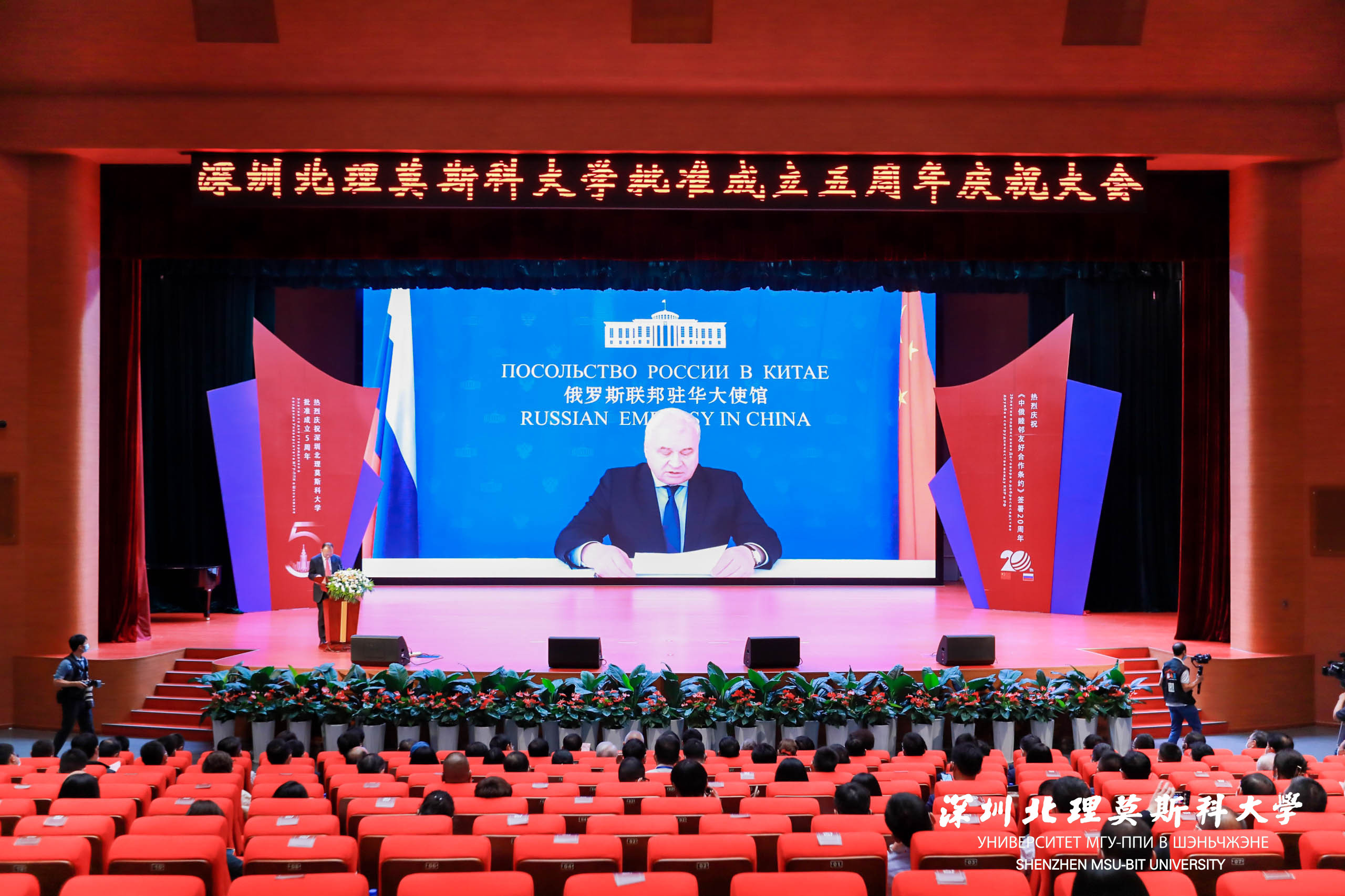 中國前駐哈薩克斯坦大使姚培生,俄羅斯聯邦駐廣州總領事館總領事亞歷山大·切爾諾烏索夫,深圳市委常委、組織部部長、黨校校長程步一,深圳市人民政府副市長、黨組成員鄭紅波,深圳市政協副主席吳以環,中國工程院院士丁文華,加拿大皇家科學院院士朱世平,國際棋聯副主席、中國棋聯主席葉江川,深圳北理莫斯科大學董事會原董事、深圳技術大學黨委書記張基宏,深圳職業技術學院黨委副書記、校長許建領,深圳北理莫斯科大學原副校長張建中等出席大會。深圳北理莫斯科大學校長李和章、第一副校長謝·米·沙赫賴、黨委副書記陳超峰以及部分師生代表參加大會。由于疫情防控原因,部分領導及嘉賓無法親臨現場,他們通過線上方式發來祝賀,他們是:俄羅斯歷史協會主席、前國家杜馬主席、原深圳北理莫斯科大學籌建組委會主席謝爾蓋·納雷什金,俄羅斯聯邦科教部部長瓦列里·法利科夫、中國駐俄大使張漢暉、俄羅斯駐華大使杰尼索夫、北京理工大學校長張軍院士、莫斯科大學校長薩多夫尼奇院士、深圳北理莫斯科大學董事會主席卡爾梅科夫院士。慶祝大會由深圳北理莫斯科大學黨委書記、副校長朱迪儉主持。