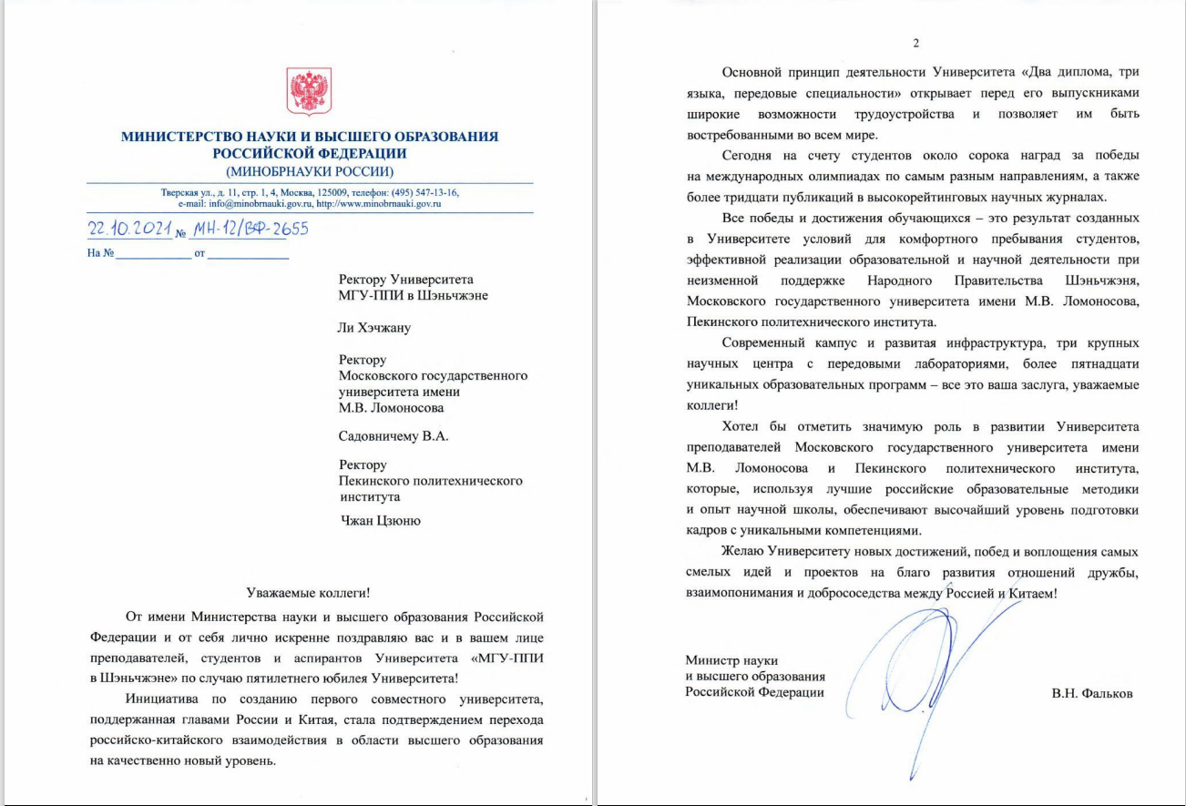 俄羅斯聯邦科教部部長瓦列里·法利科夫為慶祝大會發來賀信。他指出,深北莫的建立得到了俄中首腦的支持,成為了高等教育領域協作向高質量、新高度邁進的證明。莫大和北理工兩所頂尖大學的教師們在學校的發展中扮演了重要角色,他們使用俄羅斯最好的教學方法與科學流派的經驗為最高水平的、擁有獨一無二技能的人才培養提供了保障。