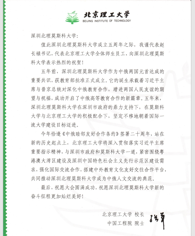 中國工程院院士、北京理工大學校長張軍發來賀信。他表示,深北莫的誕生承載著中俄兩國元首對深化中俄教育合作,增進兩國人民友誼的期望與祝福,成功開啟了中俄高等教育合作的新篇章。北理工將深入貫徹落實習近平主席重要指示精神,與深圳市政府和莫斯科大學一道,緊密圍繞粵港澳大灣區建設及深圳中國特色社會主義先行示范區建設需求,強化國際交流合作,搭建中外教育文化友好交往合作平臺,共同推動深北莫成為中俄人文交流的典范。