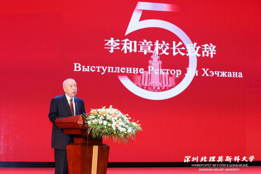 深圳北理莫斯科大學校長李和章發表致辭。李和章校長回顧了學校五年來所走過的極不平凡的辦學歷程,并代表全校師生員工向中俄教育主管部門、廣東省、深圳市、莫斯科大學、北京理工大學以及社會各界人士表示衷心的感謝和崇高的敬意。他認為,深北莫的五年既是謀定即行、和衷共濟的五年,又是銳意進取、合作共贏的五年。