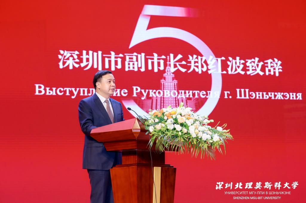 深圳市人民政府副市長、黨組成員鄭紅波代表市委市政府向深北莫批準成立五周年表達祝賀。他表示,學校辦學五年成效初顯,辦學規模和質量進一步提升,構建了本、碩、博完整的人才培養體系,學校今年還納入了廣東省高水平大學建設計劃,初步建成了富有特色的中俄合作大學,成為中俄教育科研文化交流的重要橋梁和紐帶。希望學校抓住機遇,充分發揮自身資源優勢,進一步突出辦學特色,提升辦學質量和水平,加快建設富有特色的世界一流綜合性大學,打造中俄合作辦學典范,為推動“一帶一路”建設和中俄戰略合作作出更大的貢獻。深圳市委市政府將一如既往地為學校建設發展提供充足條件和堅強保障。