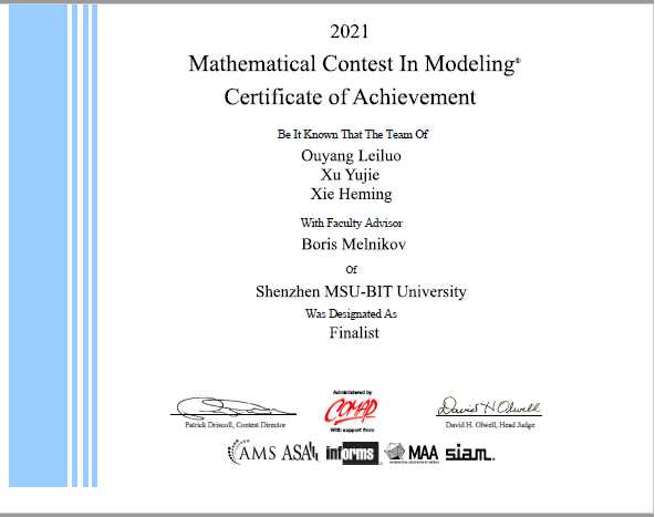 美國大學(xué)生數(shù)學(xué)建模競賽(MCM/ICM)由美國數(shù)學(xué)及其應(yīng)用聯(lián)合會主辦,是唯一的國際性數(shù)學(xué)建模競賽,也是世界范圍內(nèi)最具影響力的數(shù)學(xué)建模競賽,賽題內(nèi)容涉及經(jīng)濟(jì)、管理、環(huán)境、資源、生態(tài)、醫(yī)學(xué)、安全、未來科技等眾多領(lǐng)域。獎項包括Outstanding Winner(特等獎,獲獎比例0.14%)、Finalist(特等獎提名獎,獲獎比例2.2%)、Meritorious Winner(一等獎,獲獎比例6.8%)、Honorable Mention(二等獎,獲獎比例20.4%)。2021年美國大學(xué)生數(shù)學(xué)建模競賽共有來自世界各地共26000多支隊伍參加競賽,競爭異常激烈。