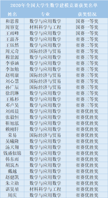 在2020年全國大學(xué)生數(shù)學(xué)建模競賽中,由2019級數(shù)學(xué)與應(yīng)用數(shù)學(xué)專業(yè)學(xué)生和思蓉、2018級材料科學(xué)與工程專業(yè)學(xué)生周容寬、2018級數(shù)學(xué)與應(yīng)用數(shù)學(xué)專業(yè)學(xué)生王雨峰組成的隊伍斬獲國賽一等獎,這也是學(xué)校首次獲得該獎項,刷新最高獲獎記錄。此外,由學(xué)校學(xué)生組成的隊伍還榮獲省賽二等獎1項、省賽三等獎3項、省賽優(yōu)勝獎5項。