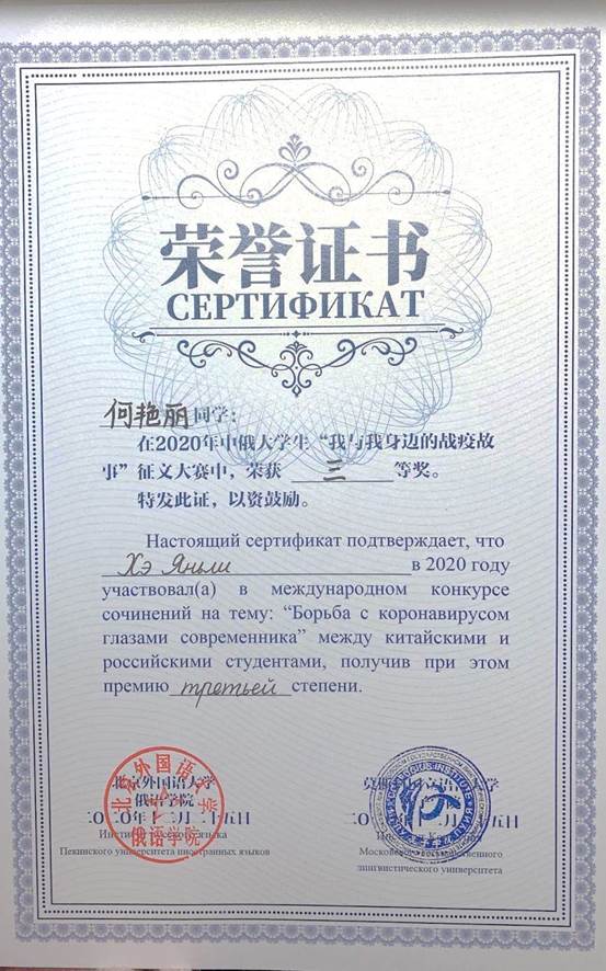 日前,深圳北理莫斯科大學(xué)語(yǔ)言文學(xué)系研究生何艷麗在“我與我身邊的戰(zhàn)役故事”為主題的國(guó)際作文比賽中榮獲三等獎(jiǎng)。