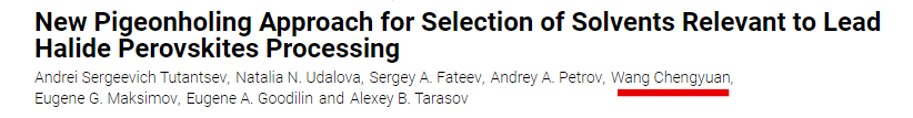 近日,在莫斯科大學材料科學系太陽能新材料實驗室主任阿列克謝·塔拉索夫博士和初級研究員安德烈·彼得羅夫老師的指導帶領下,深圳北理莫斯科大學材料科學系三年級學生王程遠的科研課題取得了良好的研究成果,其合作撰寫的論文“選擇鹵化物鈣鈦礦加工溶劑的新分類方法(New Pigeonholing Approach for Selection of Solvents Relevant to Lead Halide Perovskites Processing)”在著名國際期刊《Journal of Physical Chemistry С》上發表,該期刊在物理化學領域具有一定國際影響力,影響因子 (Impact factor,IF)為4.309。