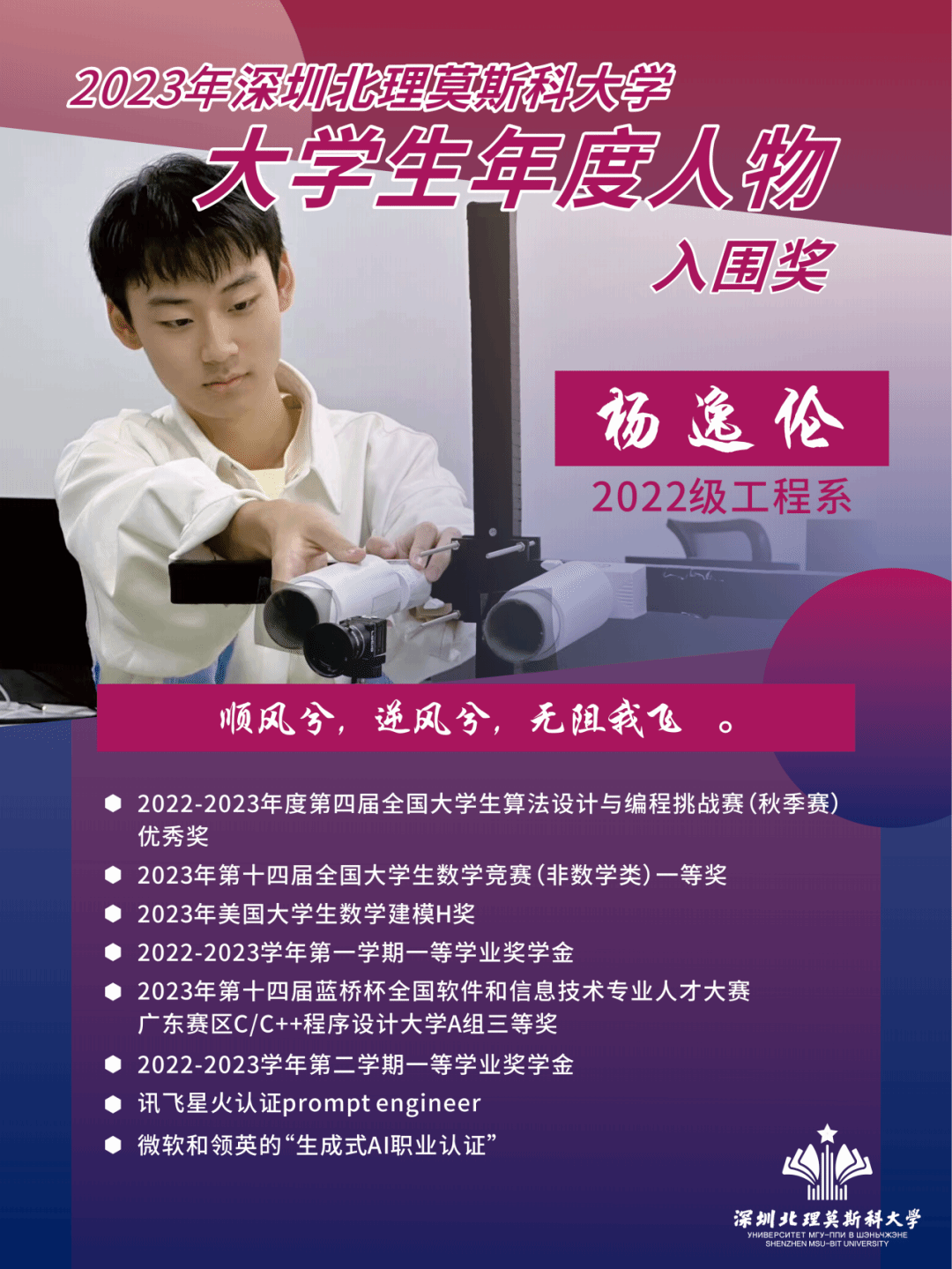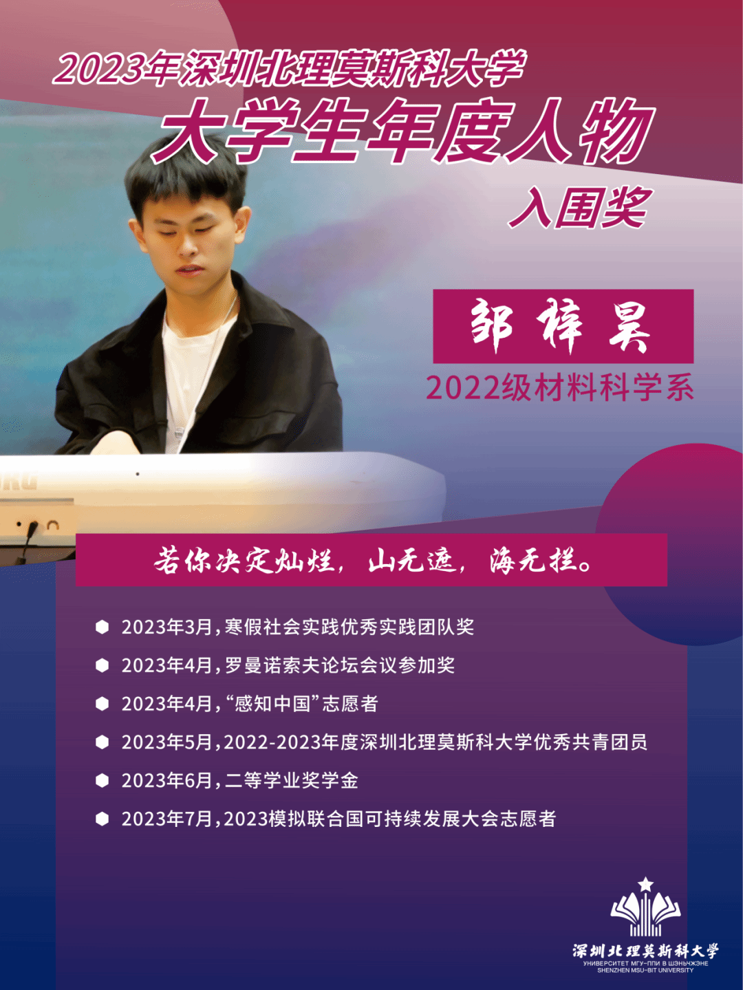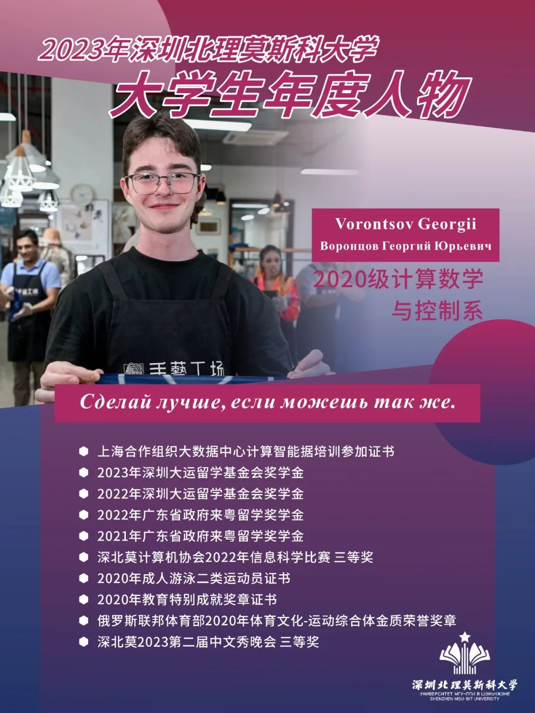 享受過程,刻苦學習。進入深圳北理莫斯科大學后,他繼續勤奮地學習。截至2023年,他已連續多次獲得學校頒發的獎學金,包括兩次廣東省政府來粵留學生獎學金以及兩次深圳大運留學基金會資助。這些獎學金不僅為他的中國學習和生活提供了經濟支持,還使他更加專注于學習過程。