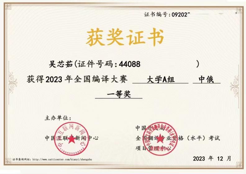 近日,由中國互聯網新聞中心、中國外文局CATTI項目管理中心主辦的2023年全國編譯大賽獲獎名單公布,深圳北理莫斯科大學語言系周興武老師指導的2022級碩士研究生吳芯茹同學獲得大學A組中俄編譯一等獎的優異成績。
