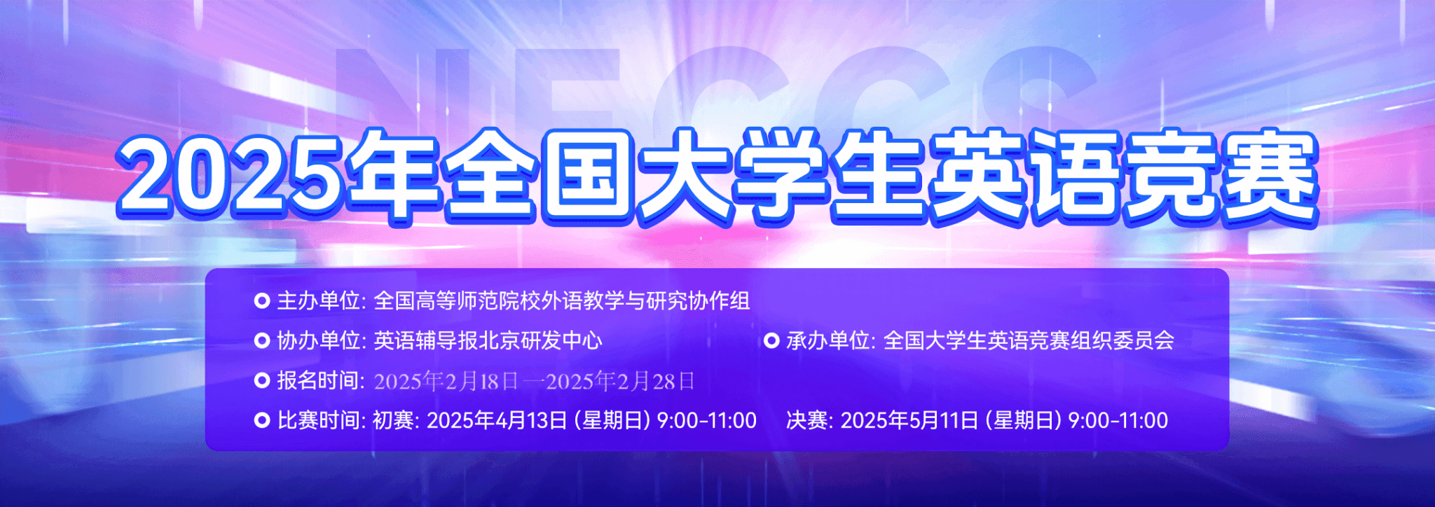 為全面提高大學生英語綜合運用能力,激發廣大大學生學習英語的積極性,鼓勵大學階段英語學習成績優秀的大學生,推動全國大學各階段英語教學質量邁上一個新臺階,國際英語外語教師協會中國英語外語教師協會、高等學校大學外語教學研究會決定舉辦2025年全國大學生英語競賽,本屆競賽是第二十七屆全國大學生英語競賽。