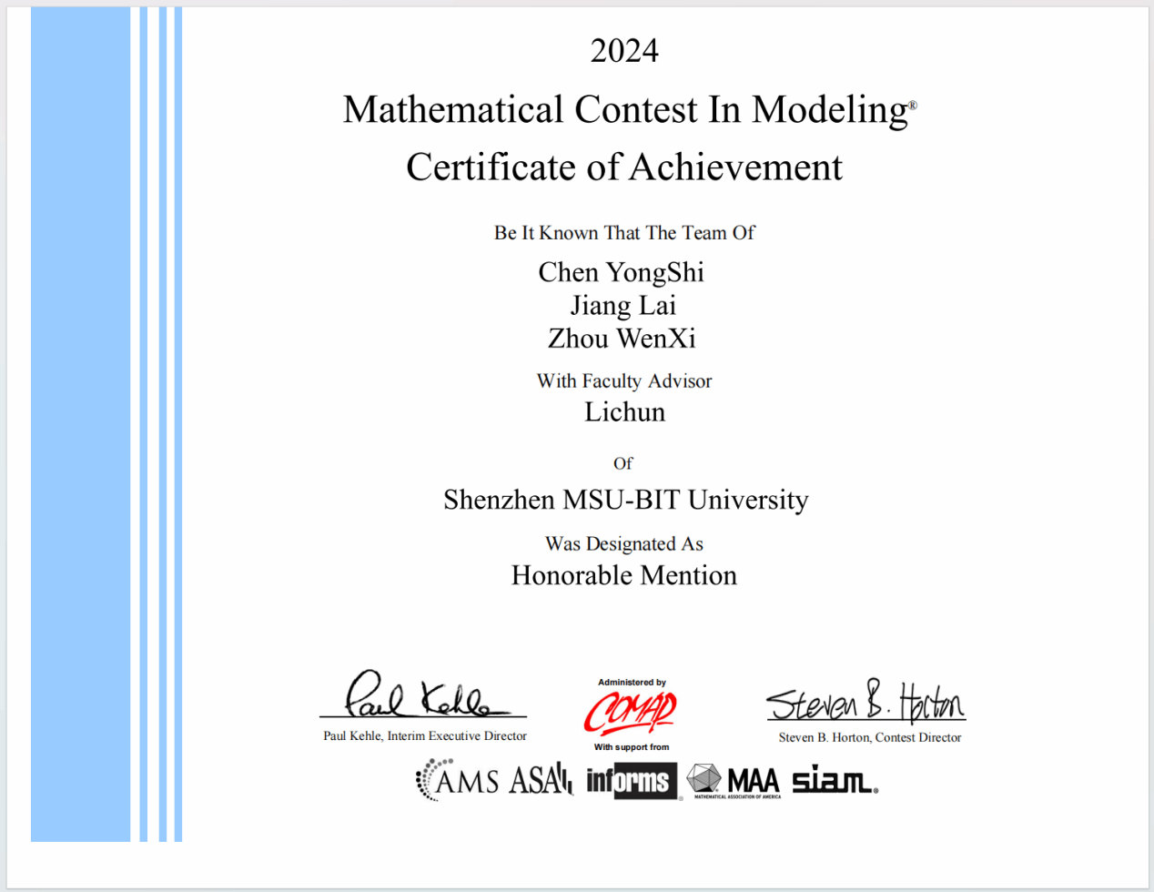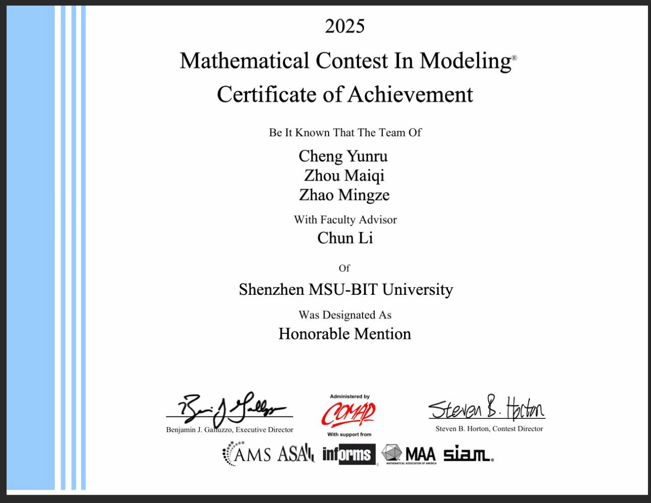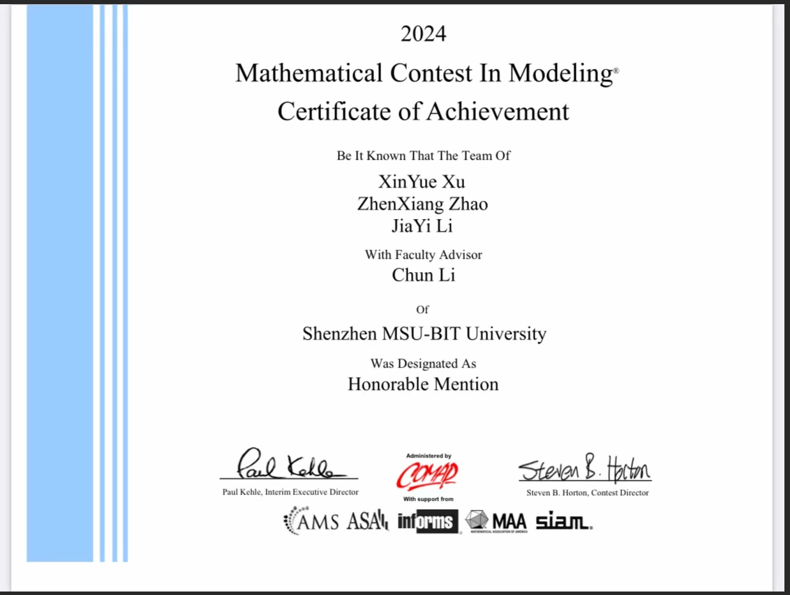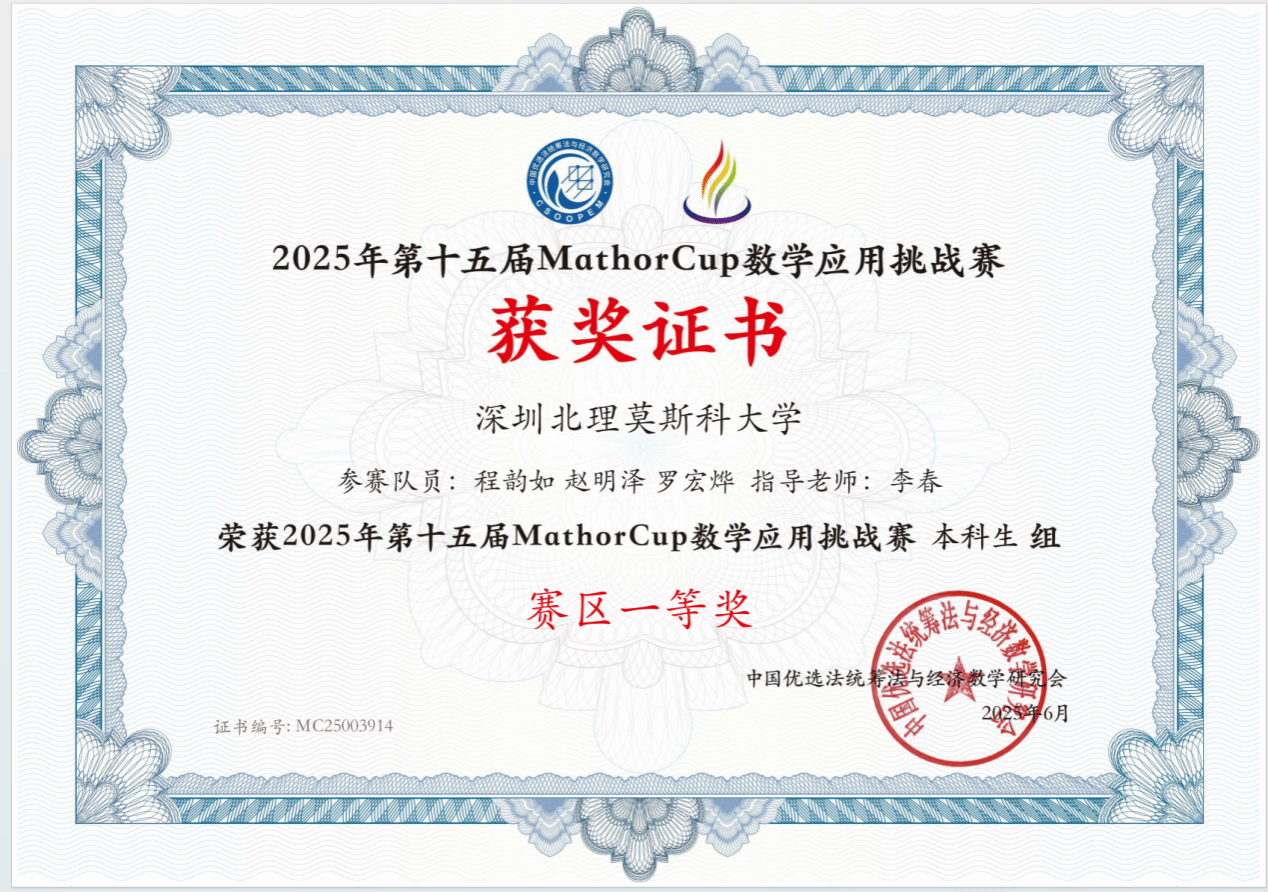 在人才培養方面,李春搭建了“導師—助教—朋輩”三級協同機制,通過建模訓練營、論文共讀與開源復現等方式,系統提升學生的創新實踐能力。近三年來,他指導的學生在美國大學生數學建模競賽中榮獲4項H獎,在全國大學生數學建模競賽中獲得省級一等獎1項、三等獎2項,在亞太地區大學生數學建模競賽中取得二等獎1項,在“挑戰杯”廣東大學生課外學術科技作品競賽中獲得三等獎。