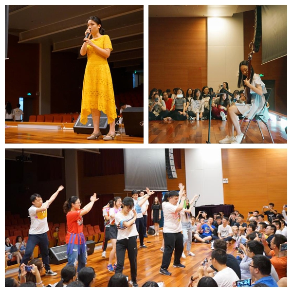 8月11日晚,新生們迎來了入學后的第一次文藝聯歡。與以往的形式有別,全體新生圍坐在會堂的舞臺上,與表演者近距離接觸。同學們紛紛展示了自己多才多藝的一面,氣氛輕松而歡快。