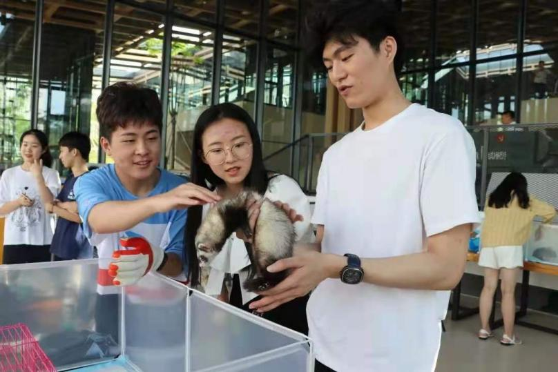 (圖為本校同學與來訪小動物互動)