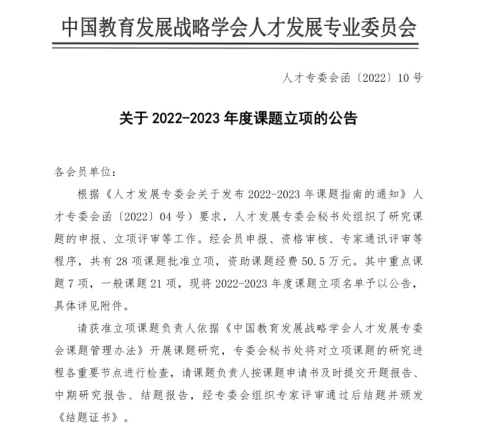 近日,中國教育發展戰略學會人才發展專業委員會發布關于2022-2023年度課題立項的公告。經會員申報、資格審核、專家通訊評審等程序,共有28項課題脫穎而出,獲批準立項。