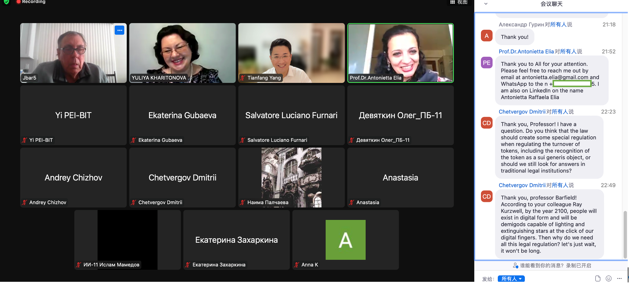 論壇云集了4大洲8個國家的12位發言人,會議主席由深北莫第一副校長、中俄法學比較研究中心主任謝·米·沙赫賴教授和莫斯科大學人工智能與數字經濟法研究中心主任、企業教研室教授尤·謝·哈利托諾娃教授擔任,深北莫中俄法學比較研究中心的講師楊天放與尤·謝·哈利托諾娃教授共同擔任主持人。