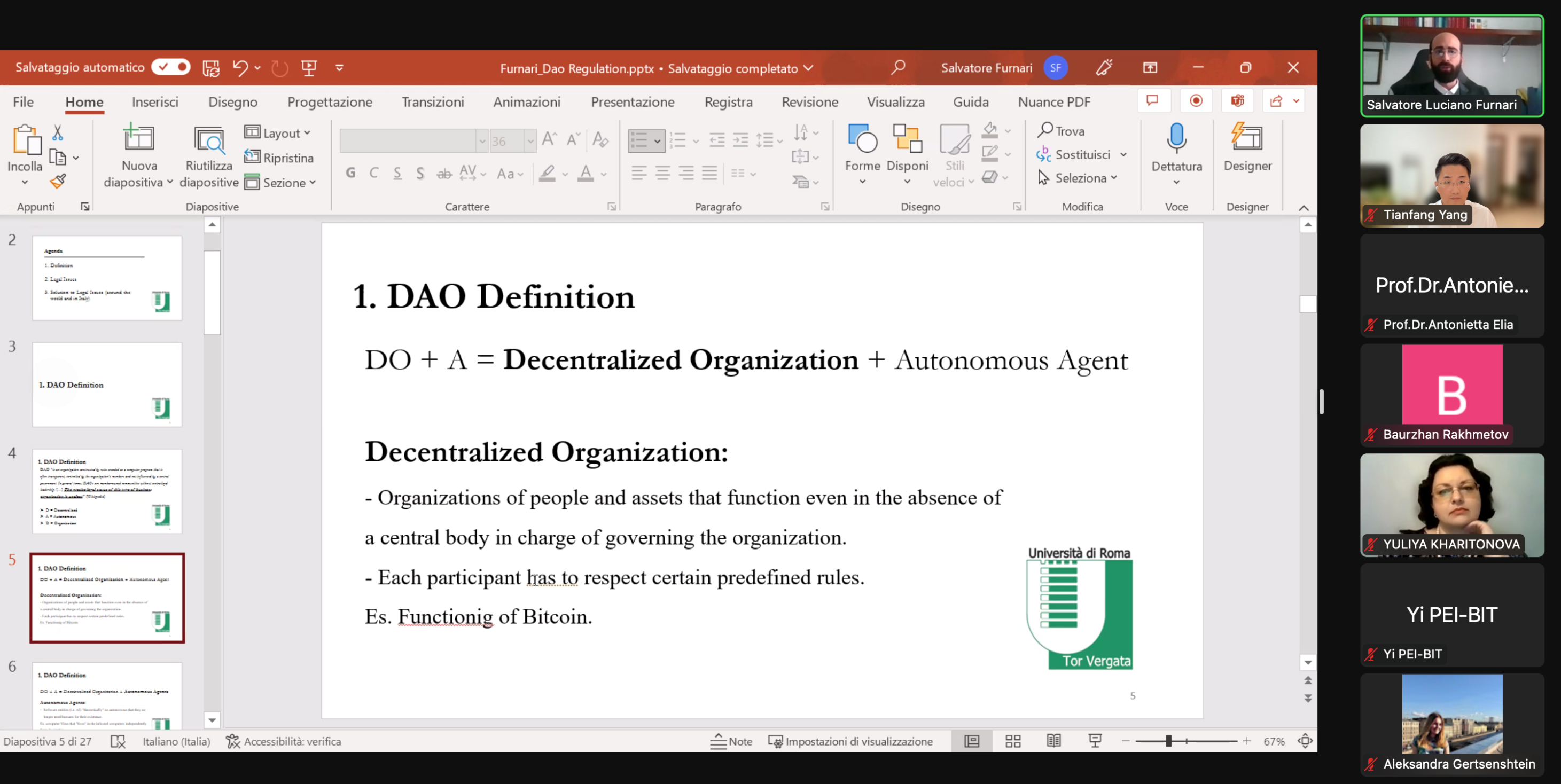意大利羅馬第二大學法律系法律系助理教授薩爾瓦多·盧西亞諾·弗納里(Salvatore Furnari)的報告圍繞對去中心化自治組織展開,其以“定義-問題-方案”為結構,以意大利的相關案例為實證提出了其對立法規制優化方案的構想。