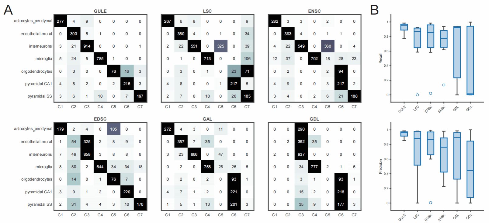 圖2:小鼠腦數據集上的腦細胞聚類方法性能對比