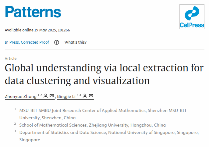 近日,深圳北理莫斯科大學計算數學與控制系教授張振躍取得重要科研突破。其作為第一作者、以深圳北理莫斯科大學為第一單位的研究論文《Global understanding via local extraction for data clustering and visualization》,在國際頂級學術期刊《Patterns》(CELL出版社子刊)上發表。該研究聚焦復雜無標簽數據聚類與可視化難題,提出GULE框架,通過類一致的局部提取、全局傳播以及自我學習,實現高精度聚類(如 RNA-seq 數據細胞類型鑒定)和拓撲結構保留可視化,為生物醫學等領域提供新工具,推動多學科數據模式發現。