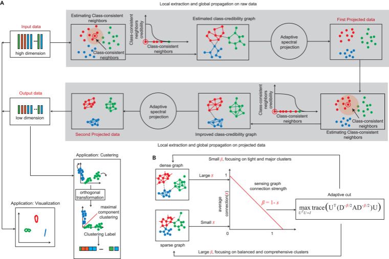 GULE(Global Understanding via Local Extraction)框架基于“局部一致性提取-全局傳播”的核心原理,通過兩層自學習網絡實現類結構解析。該方法通過兩個核心步驟實現:一是局部提取,從數據的局部連接中捕捉類別一致性,無需預先假設數據結構;二是全局傳播,將局部發現的一致性信息通過全局網絡傳遞和自我學習,最終形成完整的類別劃分。研究人員通過理論分析證明,GULE能夠高精度地還原數據中的潛在類別。此外,該方法還可用于數據可視化,在降維過程中保留類別的拓撲結構。實驗表明,GULE在聚類準確性和可視化可靠性上均顯著優于傳統方法,尤其在生物醫學等復雜數據場景中表現突出。