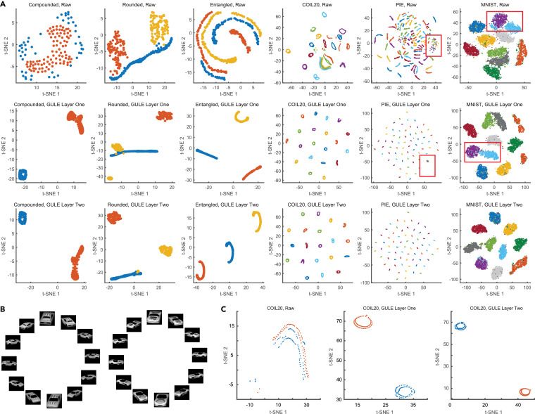 GULE通過三項關鍵技術,為復雜數據處理開辟了新路徑。首先為自適應圖切割(Acut),通過參數β調節類內連接最大化與類間連接最小化的平衡,適應不同密度和結構的數據集。其次是漸進式學習:兩層投影逐步優化類一致性,第一層處理原始數據的稀疏圖,第二層針對低維投影的密集圖進一步細化,提升聚類精度。最后通過拓撲保留可視化,結合t-SNE等技術,將原始數據與GULE投影結合,在降維中保留類內拓撲結構,如COIL20數據集的環狀結構和PIE數據集的線性模式。