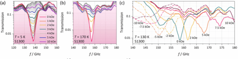 在論文中,葉甫蓋尼·戈爾巴喬夫團隊探討了通過外部磁場和溫度控制次太赫茲鐵磁共振頻譜的可能性。為此,團隊制備了 Sr0.67Ca0.33Fe8Al4O19 致密陶瓷,并首次研究了它們在 5-300 K 溫度范圍內的磁靜力學和磁動力學特性。研究表明,致密陶瓷在上述溫度范圍內都能持久保持高硬磁性(矯頑力為 10-20 kOe)和140-200GHz的天然鐵磁共振頻率。此材料在高達 20和10 kOe的磁場中具有抗再磁化能力,可通過磁場對鐵磁共振頻率進行可逆調節。最初未磁化的樣品在外加磁場中的共振吸收率會降低,在磁場為 5 kOe 時吸收峰幾乎完全消失。而對于已被磁化的樣品,外加磁場每改變1 kOe,共振峰會移動2.2 GHz。根據實驗數據和模擬結果,提出了開發硬磁電介質的前景及其在太赫茲電子學中的應用。文中提出的高密度磁活性陶瓷可作為光學探測器、開關、吸收器等重要材料,可在亞太赫茲頻率、寬泛的溫度和磁場范圍內工作。