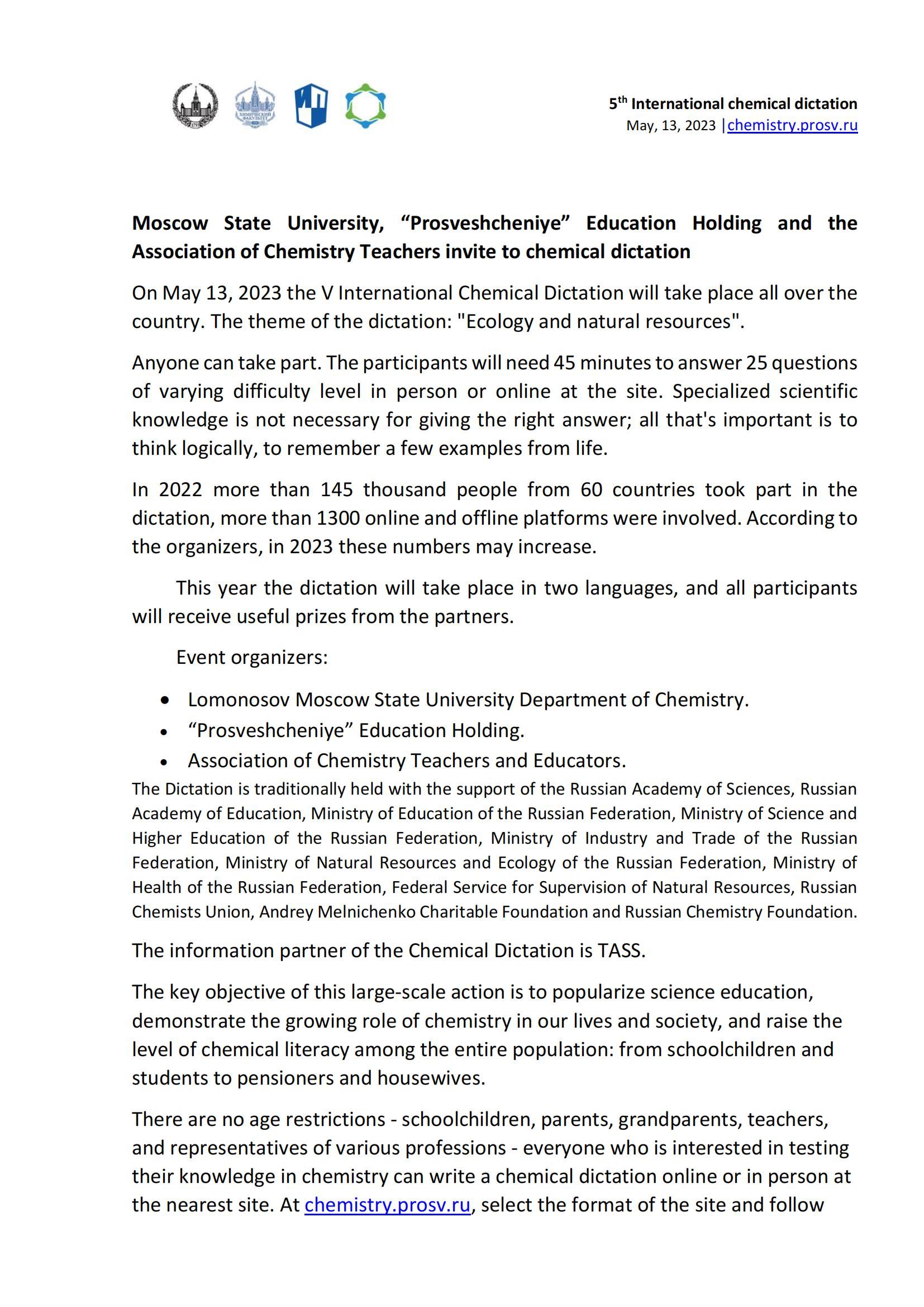 Moscow State University, “Prosveshcheniye” Education Holding and the Association of Chemistry Teachers invite to chemical dictation