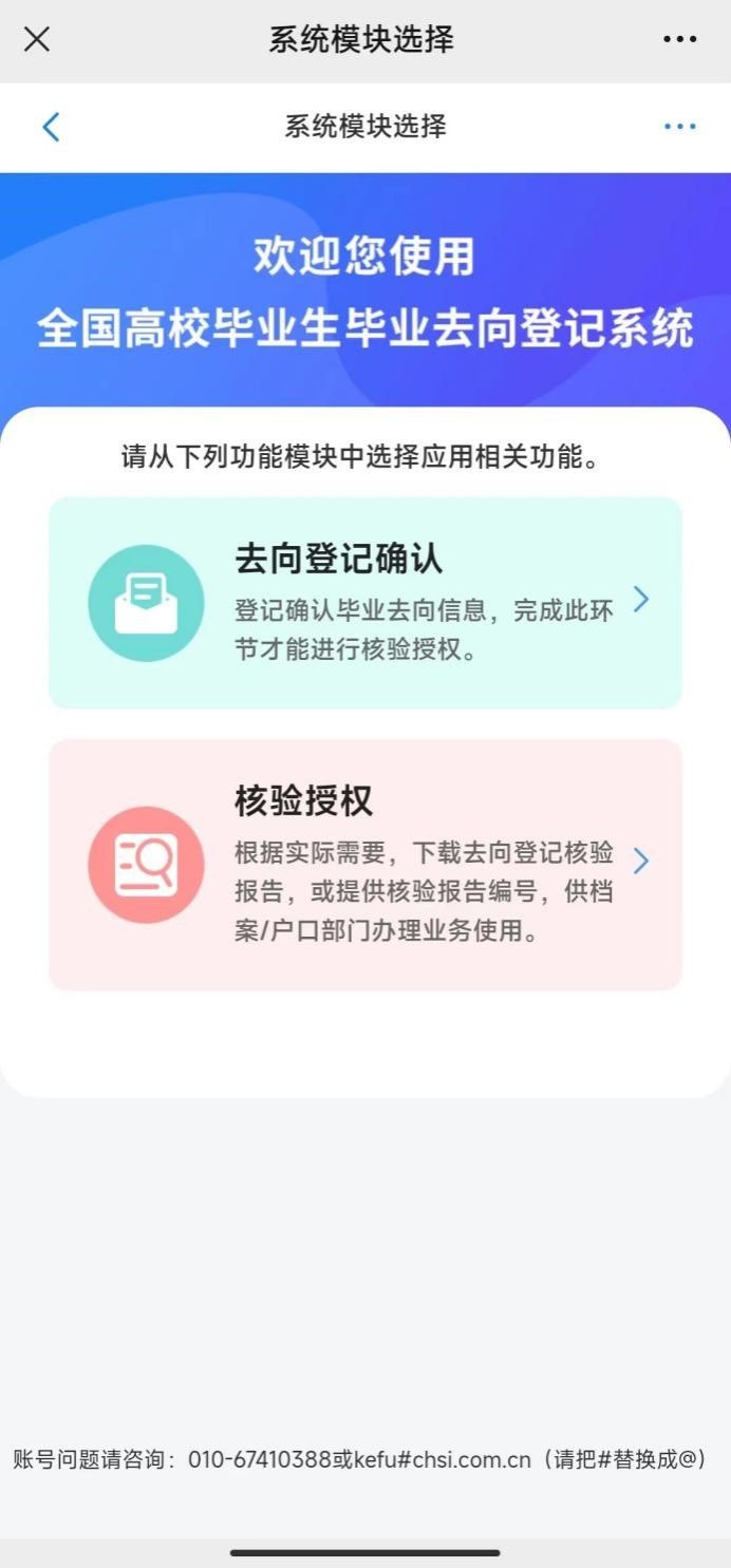 進入選擇功能模塊界面。“去向登記確認”用于登記確認畢業去向信息。