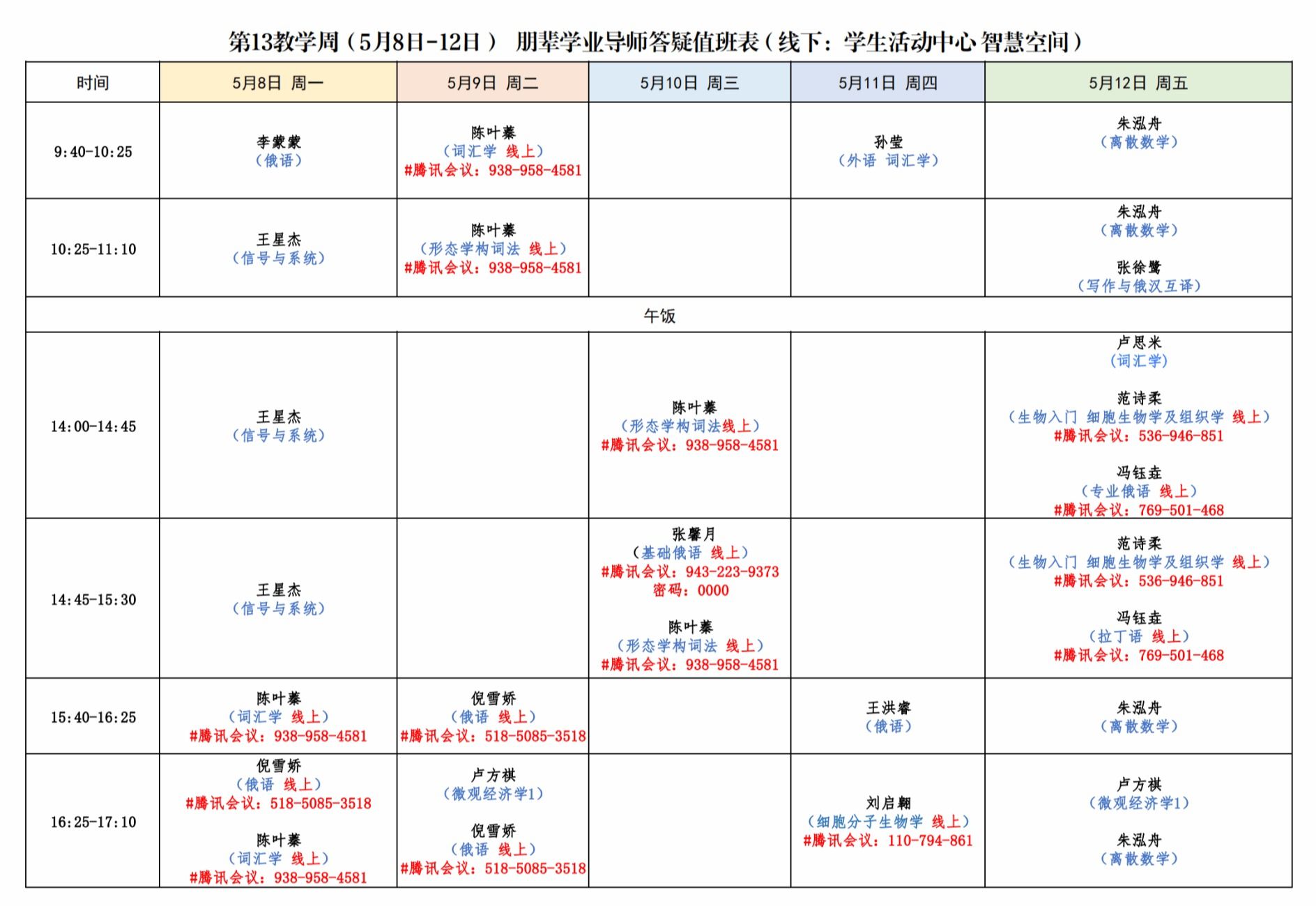 現(xiàn)將第13教學(xué)周(5月8日-12日)朋輩學(xué)業(yè)導(dǎo)師答疑值班表公布如下。各位同學(xué)可根據(jù)個人學(xué)習(xí)需求進(jìn)行線上線下咨詢。(注:線下答疑地點為學(xué)生活動中心智慧空間,線上平臺為騰訊會議)