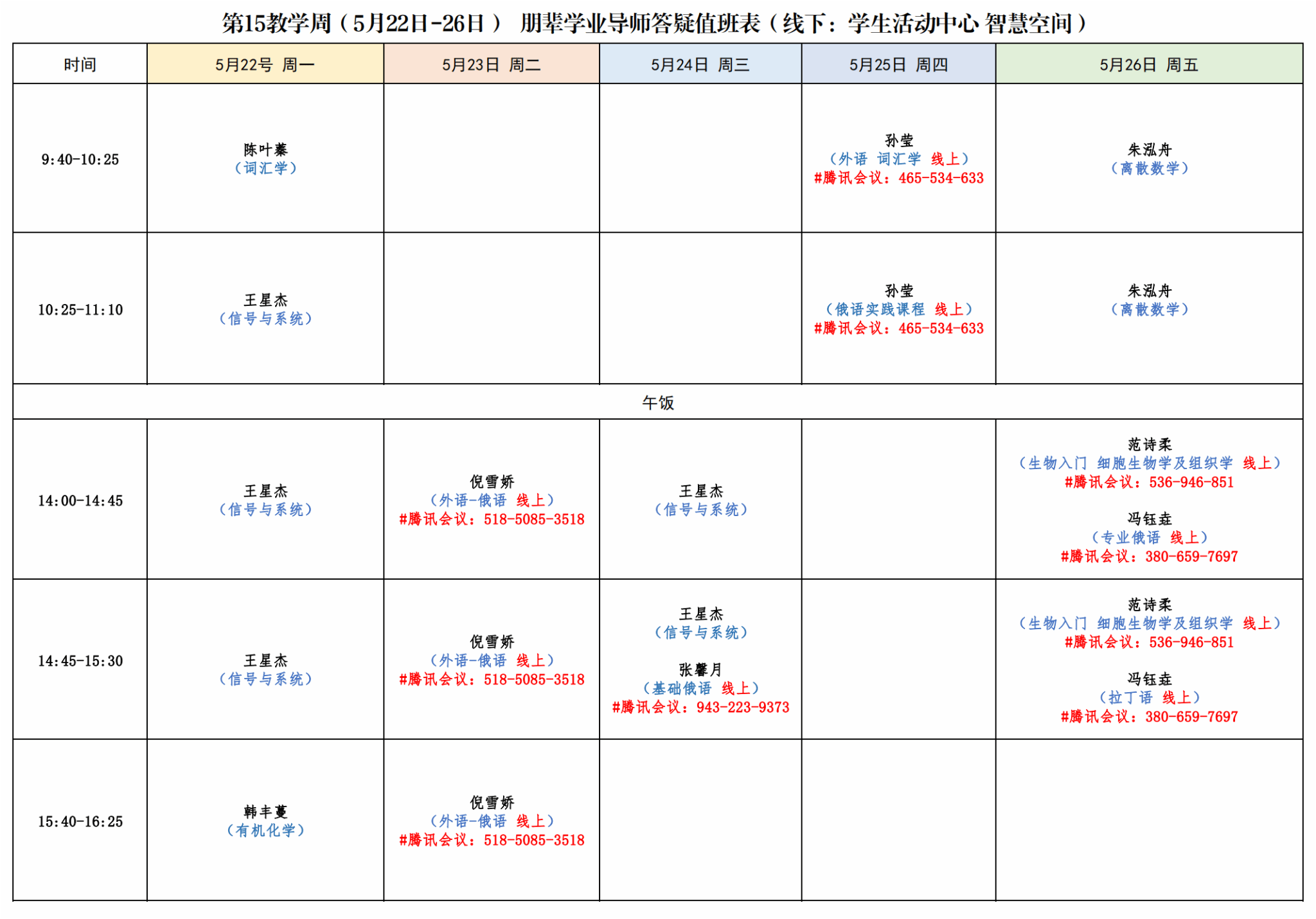 現將第15教學周(5月22日-26日)朋輩學業導師答疑值班表公布如下。各位同學可根據個人學習需求進行線上線下咨詢。(注:線下答疑地點為學生活動中心智慧空間,線上平臺為騰訊會議)