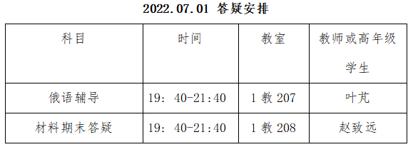 為幫助廣大同學(xué)更好的準(zhǔn)備期末考試,從6月28日起,學(xué)校將組織中方教師和高年級學(xué)生為需要幫助的學(xué)生提供答疑服務(wù)。具體答疑的科目安排學(xué)校會每日更新,請同學(xué)們注意關(guān)注信息。祝同學(xué)們考試順利!(今日發(fā)布6月30日-7月1日答疑安排)