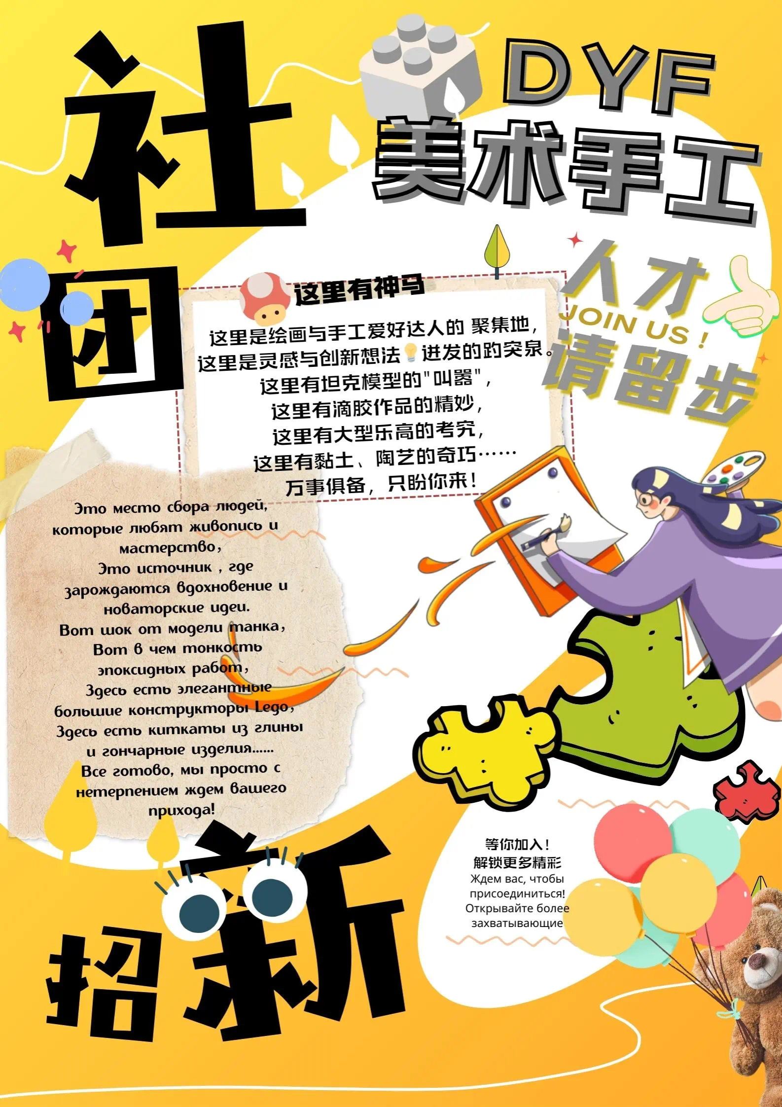 DYF手工美術(shù)社團(tuán)是屬于МГУ ППИ的藝術(shù)活動(dòng)類社團(tuán),是我校學(xué)生自愿組成,為實(shí)現(xiàn)成員共同意愿,按照其章程開展活動(dòng)的協(xié)會(huì)。繪畫社團(tuán)是隸屬于學(xué)校團(tuán)總支的社團(tuán)組織之一,是加強(qiáng)學(xué)生課余文化生活,促進(jìn)校園文化建設(shè)、培養(yǎng)學(xué)生個(gè)性發(fā)展的有利窗口,展現(xiàn)學(xué)生才華的藝術(shù)團(tuán)體。社團(tuán)定期舉行如拼裝模型,制作制品,合作繪畫等各種各樣的手工制作或者繪畫活動(dòng),也積極承擔(dān)大學(xué)集體活動(dòng)攤位,保證學(xué)生課余時(shí)間的多樣性。