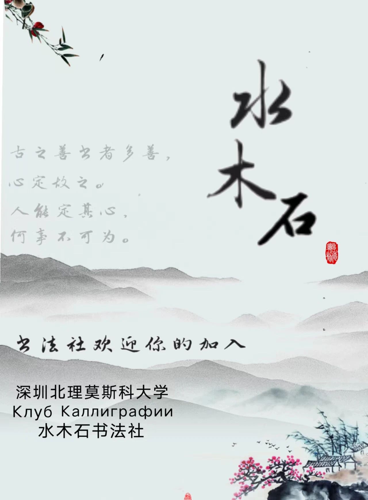 揮毫尋好友,潑墨引知音。水木石書法社成立于2017年建校之初,是一個(gè)傳承中華傳統(tǒng)書法文化的社團(tuán)?!八臼比衷醋灾袊鴤鹘y(tǒng)書法文化的書寫原料,一盒硯,一毛筆,一宣紙,寓意追根溯源、延續(xù)本源。我社致力于通過社團(tuán)活動(dòng)傳播、傳承中華書法文化,發(fā)揚(yáng)中國藝術(shù)之美、文化之精華,讓來自中國、俄羅斯、乃至世界各地的人了解中華文化、感受中華之美本社舉辦過多種活動(dòng),包括:承辦“南粵青年心向黨,執(zhí)筆青春繪夢想”書法比賽校級(jí)選拔賽;舉辦“為黨獻(xiàn)禮,共創(chuàng)錦繡”校級(jí)書法比賽;慶元旦活動(dòng);中秋游園會(huì); “我愛我?!蔽膭?chuàng)嘉年華等深受同學(xué)喜愛的活動(dòng)。