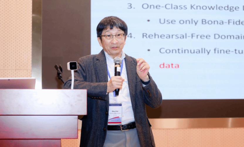 Alex Kot教授的特邀報告題目為“Presentation Attack via Face-Spoofing”,深入探討了面部識別系統(tǒng)中的安全挑戰(zhàn),特別是呈現(xiàn)攻擊問題,強(qiáng)調(diào)了在不同領(lǐng)域測試中保持方法有效性的重要性,并介紹了他們團(tuán)隊(duì)在非監(jiān)督領(lǐng)域適應(yīng)和非對稱模態(tài)轉(zhuǎn)換技術(shù)方面的最新進(jìn)展,以增強(qiáng)面部反欺騙的泛化能力。