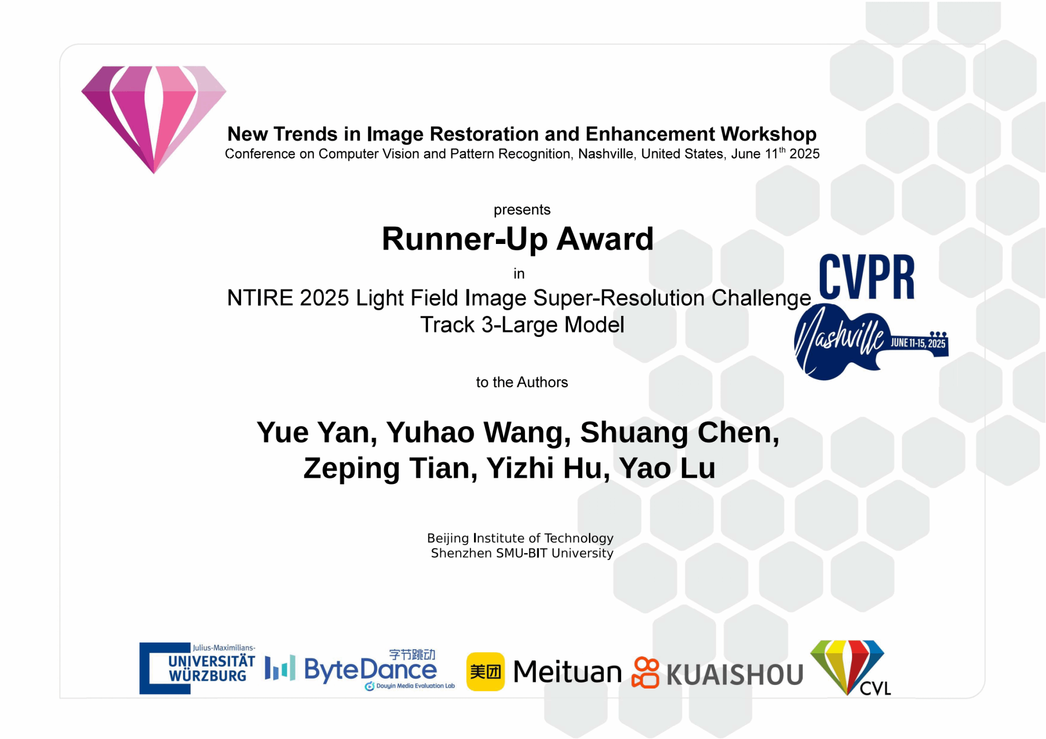 2025年6月10日,國際計算機視覺與模式識別頂級會議 CVPR(IEEE Conference on Computer Vision and Pattern Recognition)圖像恢復與增強的新趨勢(NTIRE2025)賽事結果揭曉,在光場圖像超分辨率(LFSR)挑戰賽的三個賽道中深圳北理莫斯科大學工程系代表隊(隊名:The BITSMBU Team) 獲得一個冠軍、兩個亞軍的優異成績。