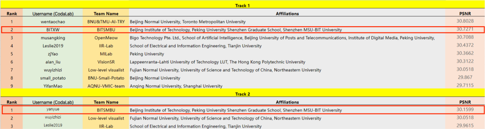 據(jù)悉,NTIRE(New Trends in Image Restoration and Enhancement)由蘇黎世聯(lián)邦理工學院計算機視覺實驗室與計算機視覺和模式識別領域全球頂級會議CVPR共同舉辦,每年舉辦一次,今年是第9屆比賽,該賽事是全球計算機圖像恢復領域最具權威性和代表性的賽事。該項賽事的賽道1旨在鼓勵參塞者探索LFSR的精度上限,排名僅由測試集上的平均PSNR值決定。賽道2旨在效率約束下的保真度測試模型大小被重新限制為1MB,FLOP被限制為20G。排名由測試集上的平均 PSNR值決定。
