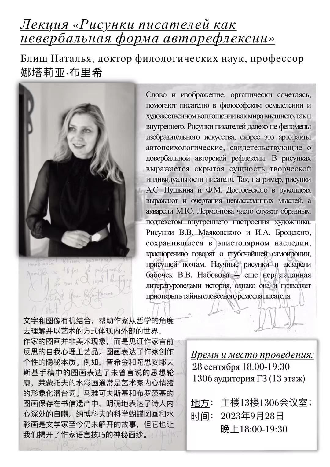 活動介紹: 文字和圖像有機結合,幫助作家從哲學的角度去理解并以藝術的方式體現內外部的世界。作家的圖畫并非美術現象,而是見證作家言前反思的自我心理工藝品。圖畫表達了作家創作個性的隱秘本質。例如,普希金和陀思妥耶夫斯基手稿中的圖畫表達了未曾言說的思想輪廓,萊蒙托夫的水彩畫通常是藝術家內心情緒的形象化潛臺詞。馬雅可夫斯基和布羅茨基的圖畫保存在書信遺產中,明確地表達了詩人內心深處的自嘲。納博科夫的科學蝴蝶圖畫和水彩畫是文學家至今仍未解開的故事,但它也讓我們揭開了作家語言技巧的神秘面紗。