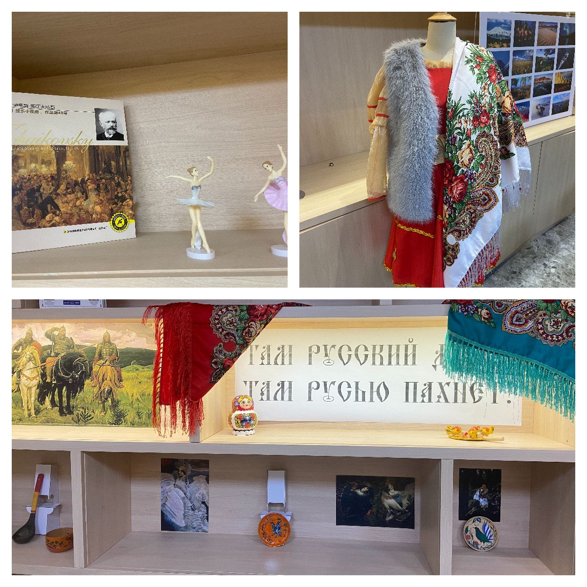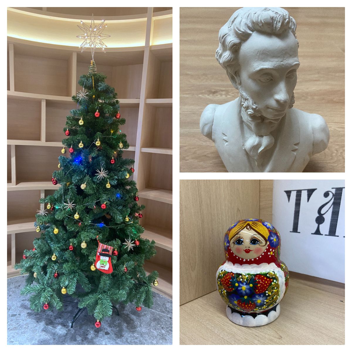 正值新年來臨之際,俄語中心教師用圣誕樹、普希金的迷你雕塑、套娃等充滿俄羅斯元素的裝飾物精心裝扮了俄語角,使這里洋溢著節日氛圍和俄羅斯文化氣息。