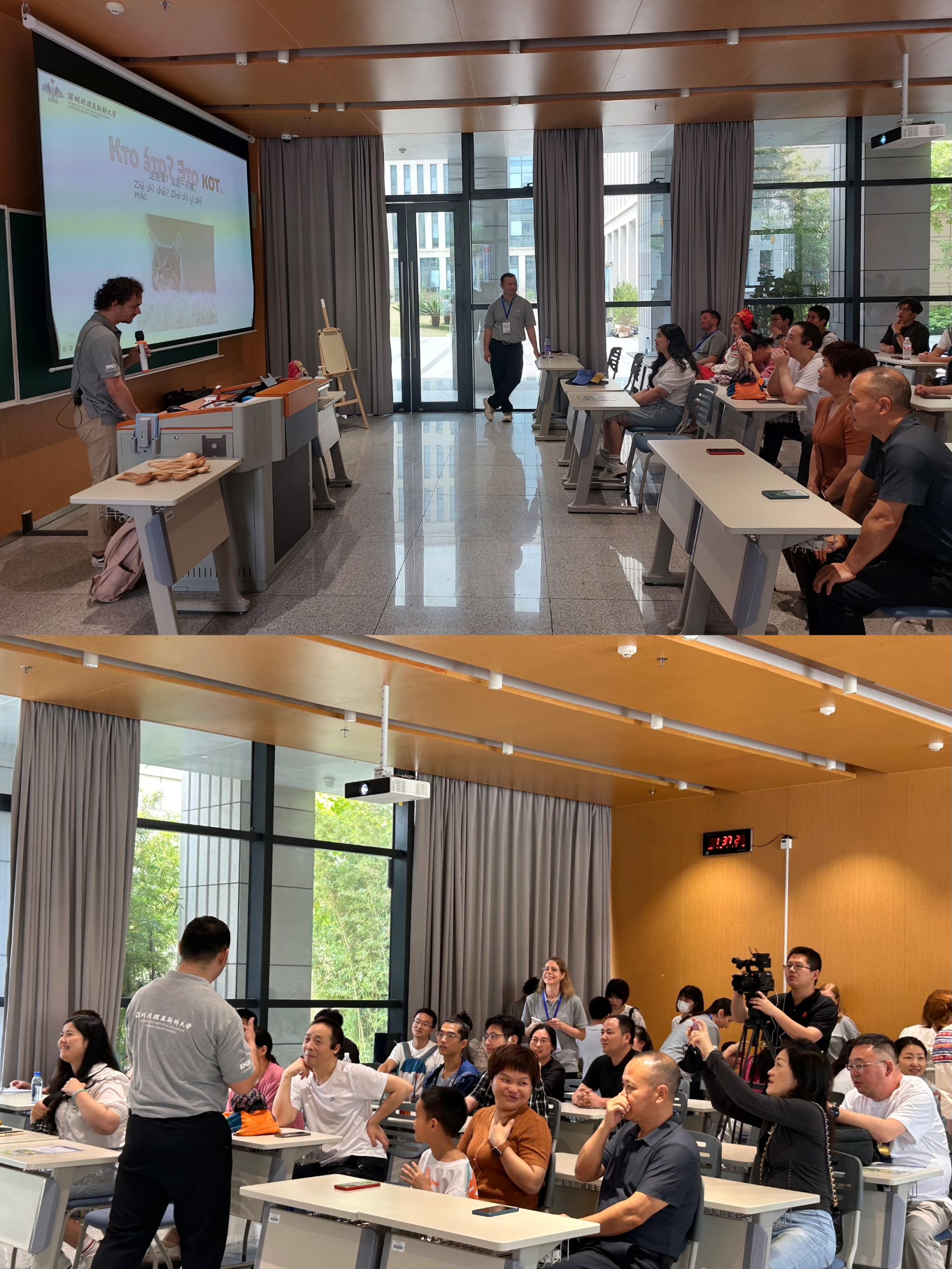 您可能會問:“怎么光講理論,沒有實踐呢?”當然,我們的活動中少不了課堂展示。這個環節由俄方教師塔拉索夫主講,俄語中心其他同事給予協助。此時,展臺變成了教室,聽眾變成了學生,他們積極回答有趣好玩的提問。來自深北莫不同專業的一、二、三年級的學生主動幫助這些新 “同學”學習俄語,并在“課堂”結束后愉快地解答考生家長感興趣的學校生活和學習方面的問題。課程結束后,這些考生家長高興地用俄語與教師們打招呼和告別!