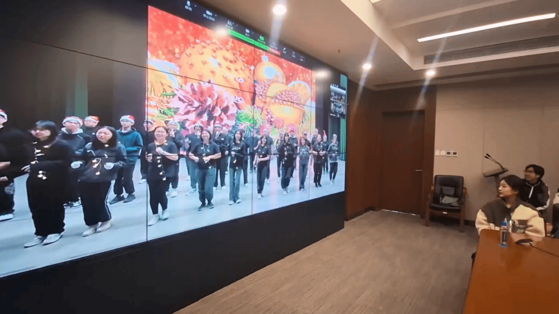 連線結束時,大家互致新年祝福。深北莫俄語中心合唱興趣小組的同學們甚至還為在莫斯科學習的同學們準備了一份音樂禮物:演唱了一首激昂歡快的新年歌曲!